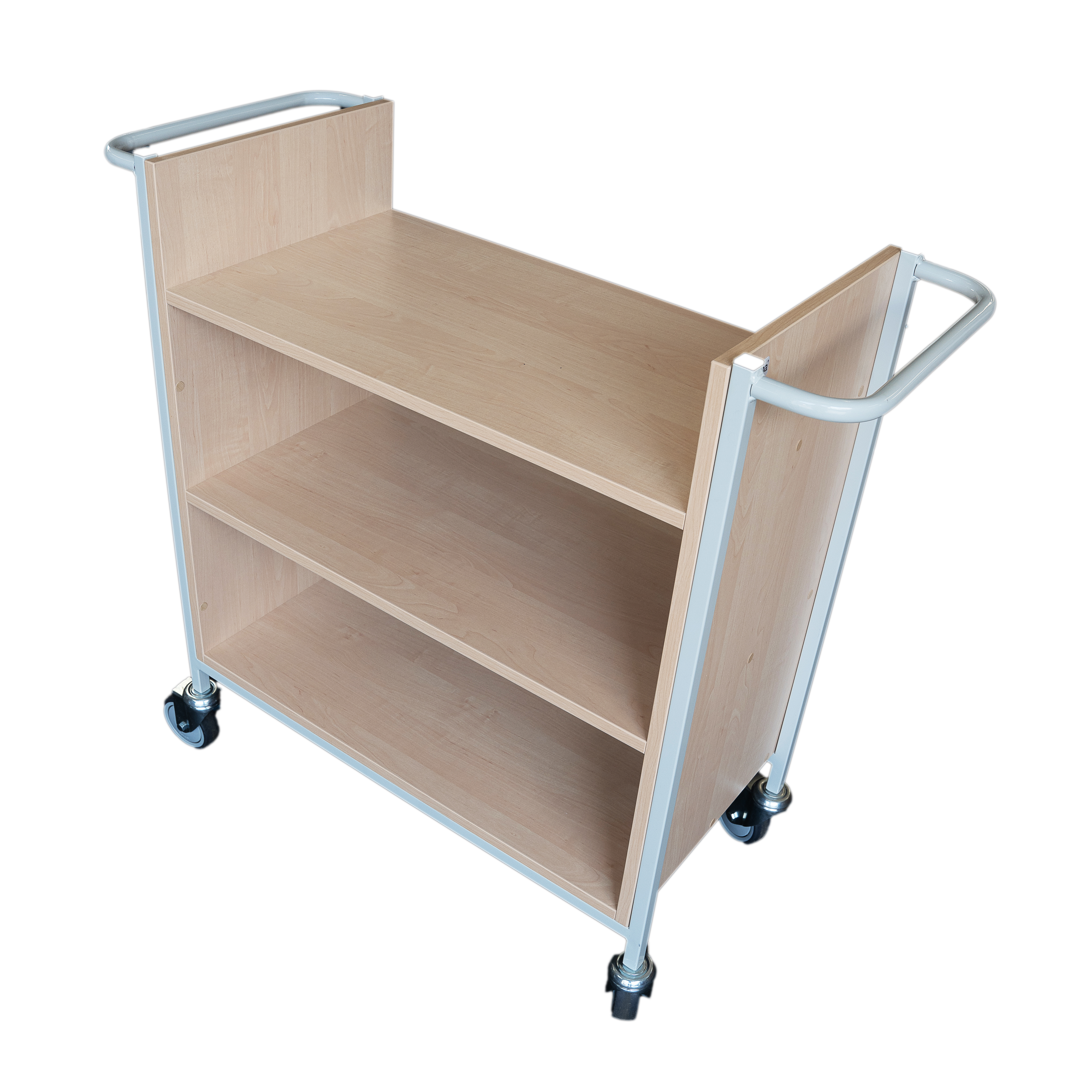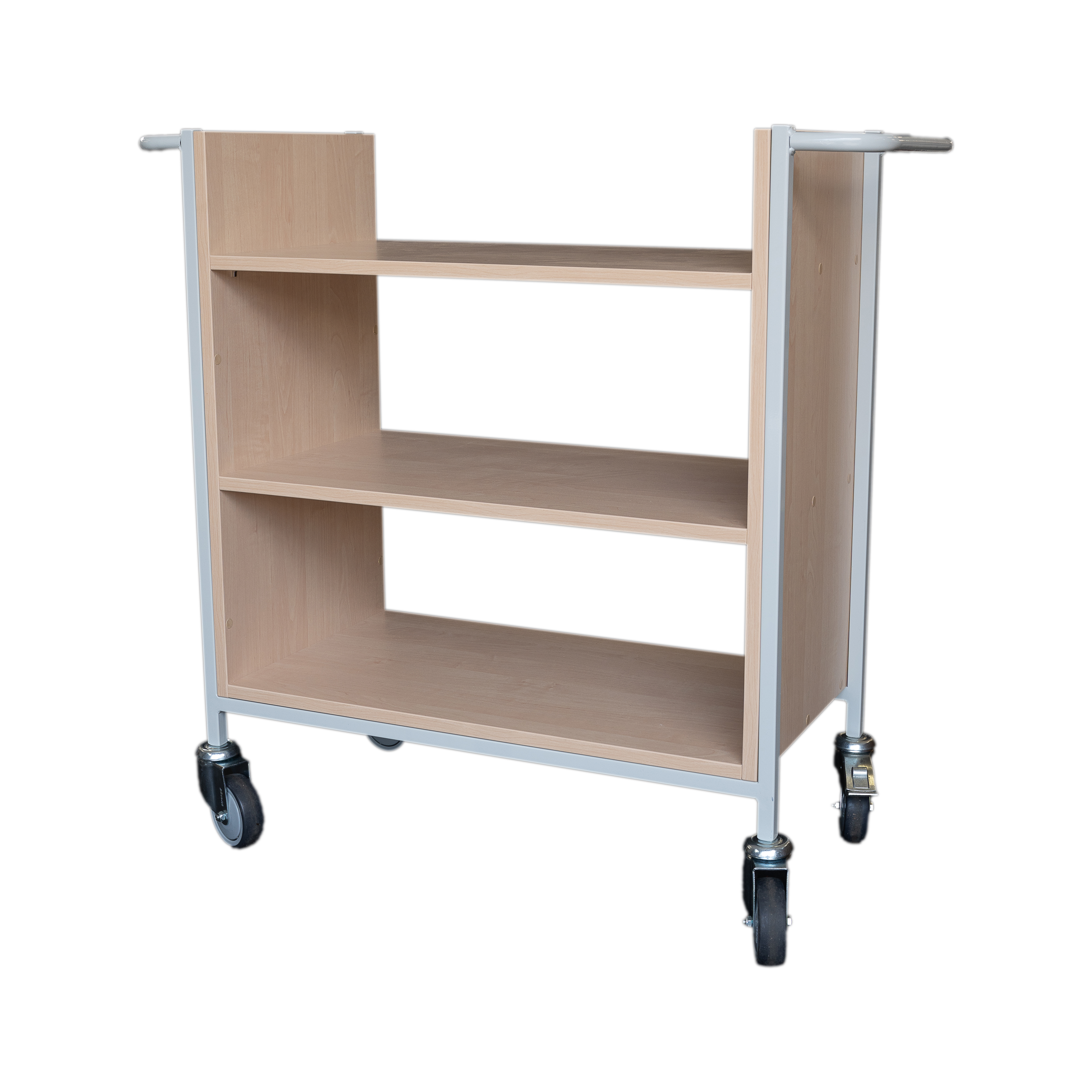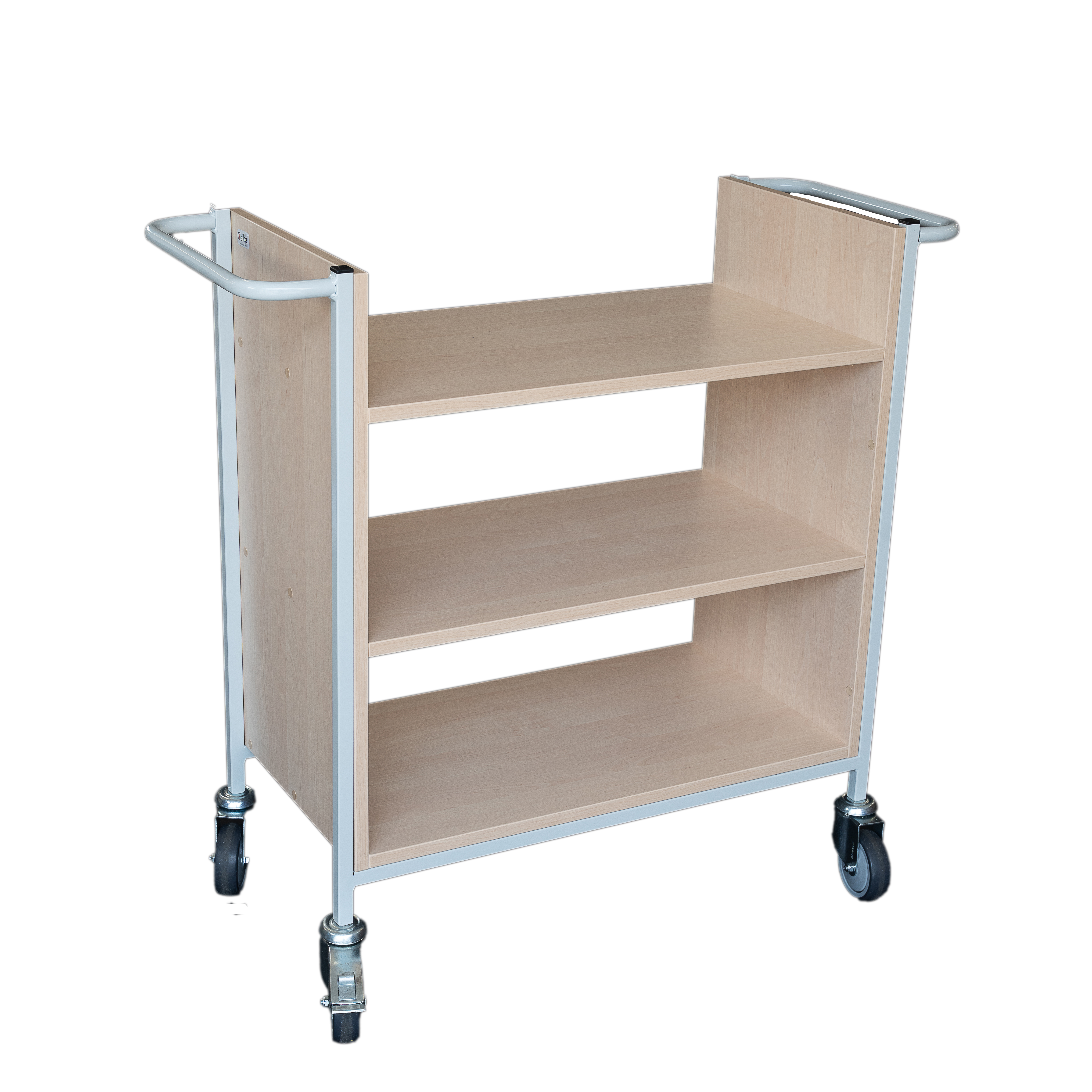 Robustní vozík s kovovou konstrukcí a dřevěnými policemi pro ukládání převážených knih, 4 velmi odolná otočná kolečka (průměr koleček 10 mm, 3 + 1 kolečko s brzdou), provedení buk/červený rám,