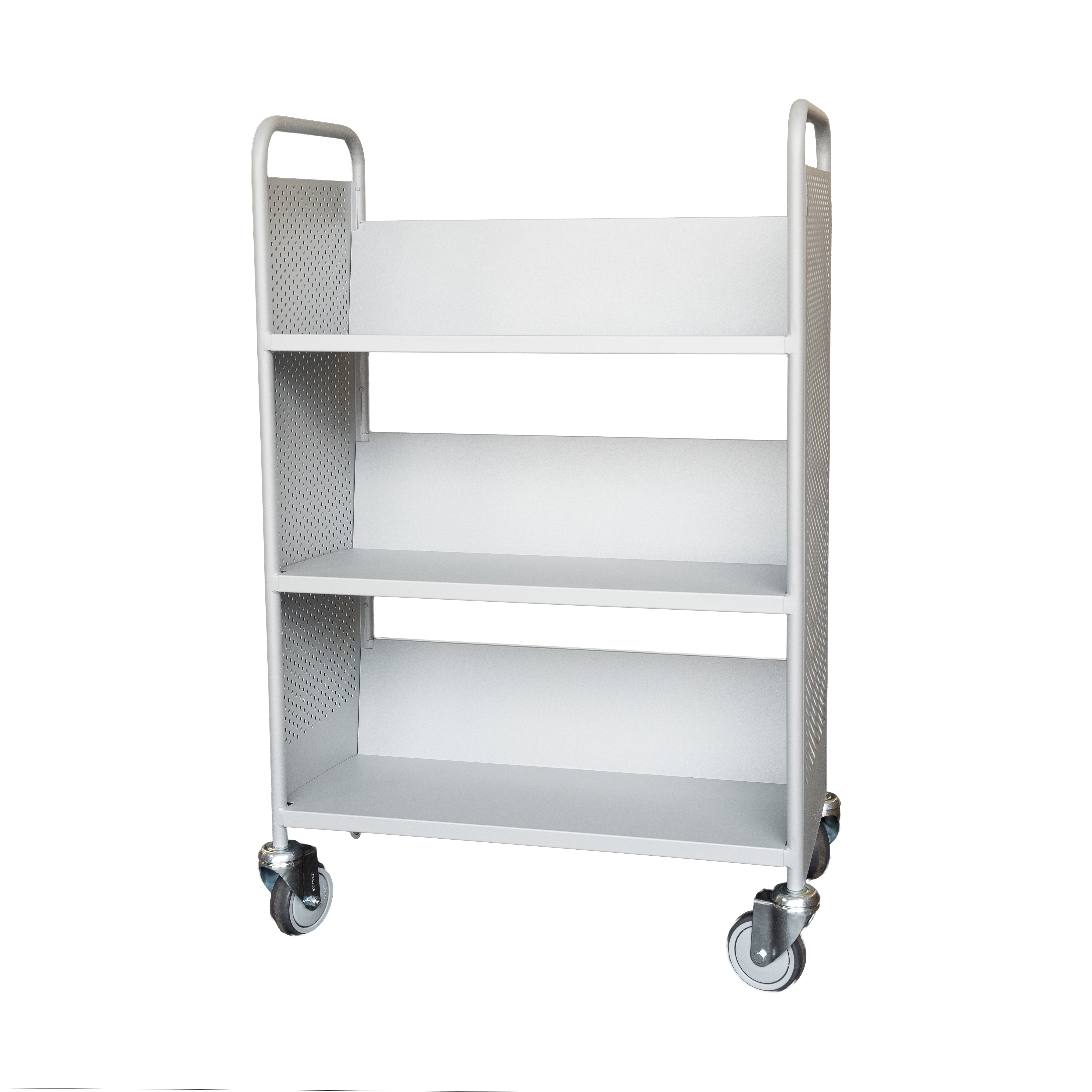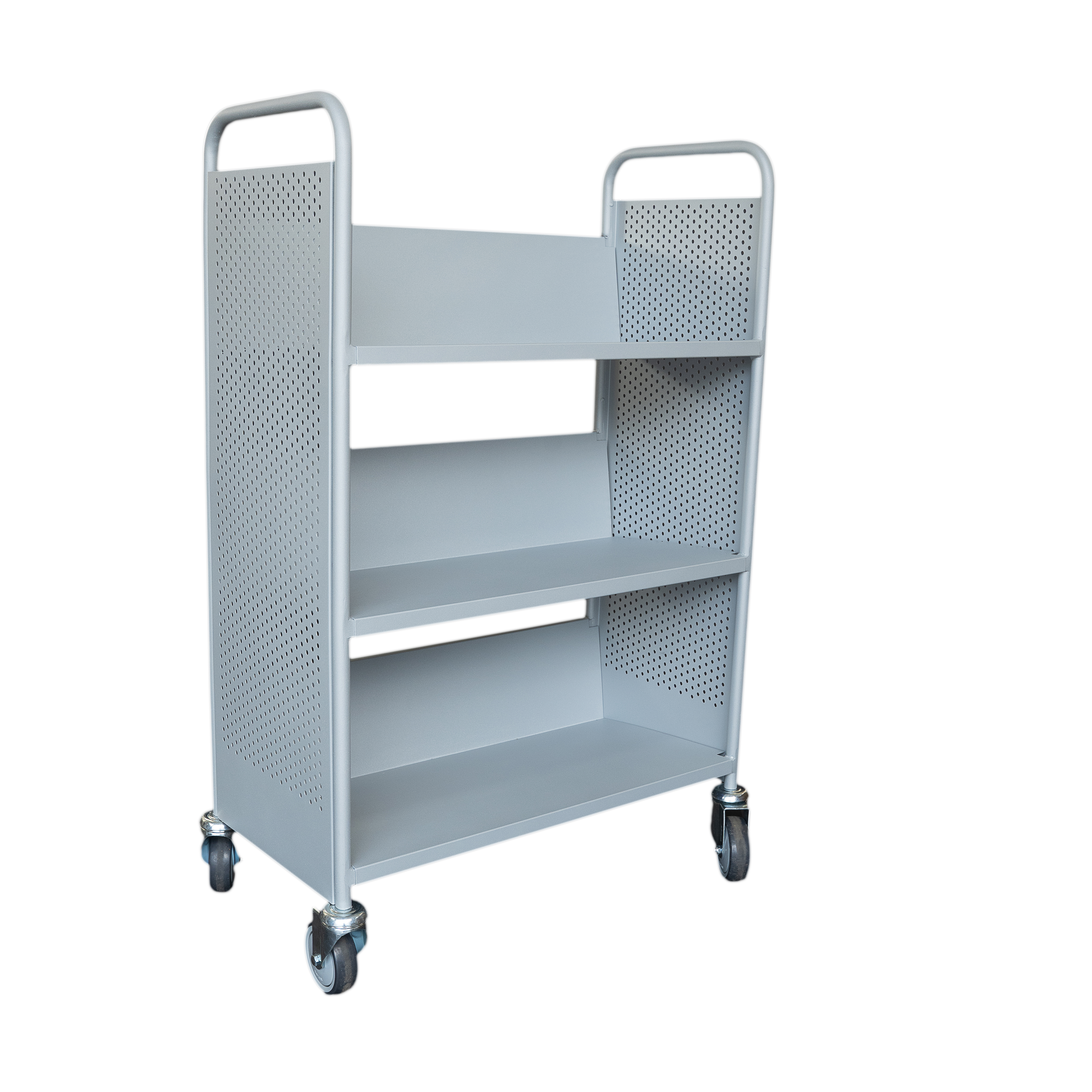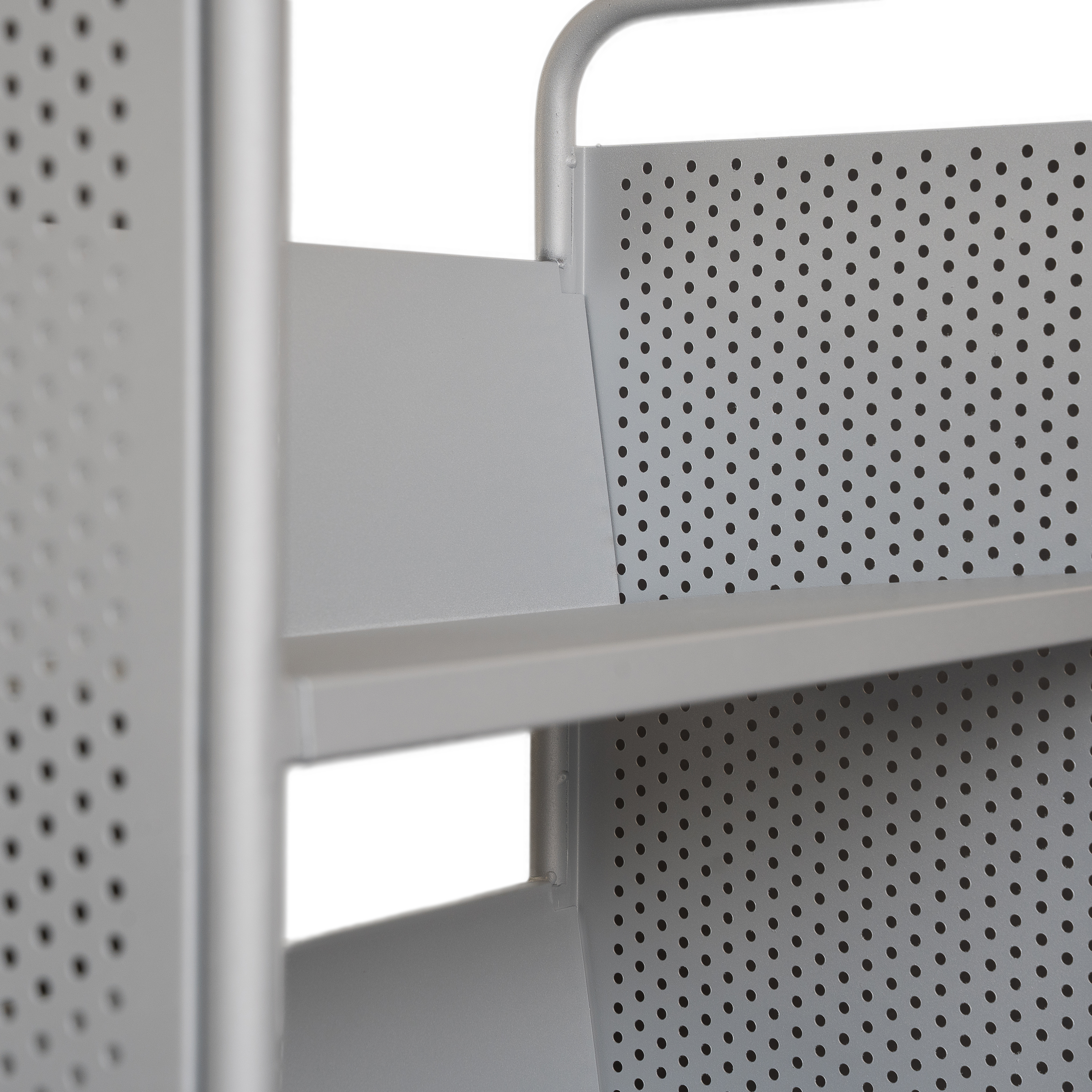 Knihovní vozík LEA, v celokovovém provedení, s vysokou nosností, 3 police nakloněné dozadu, boční designové perforované plechové bočnice, 3 kolečka + 1 kolečko s brzdou, průměr koleček 10 cm.