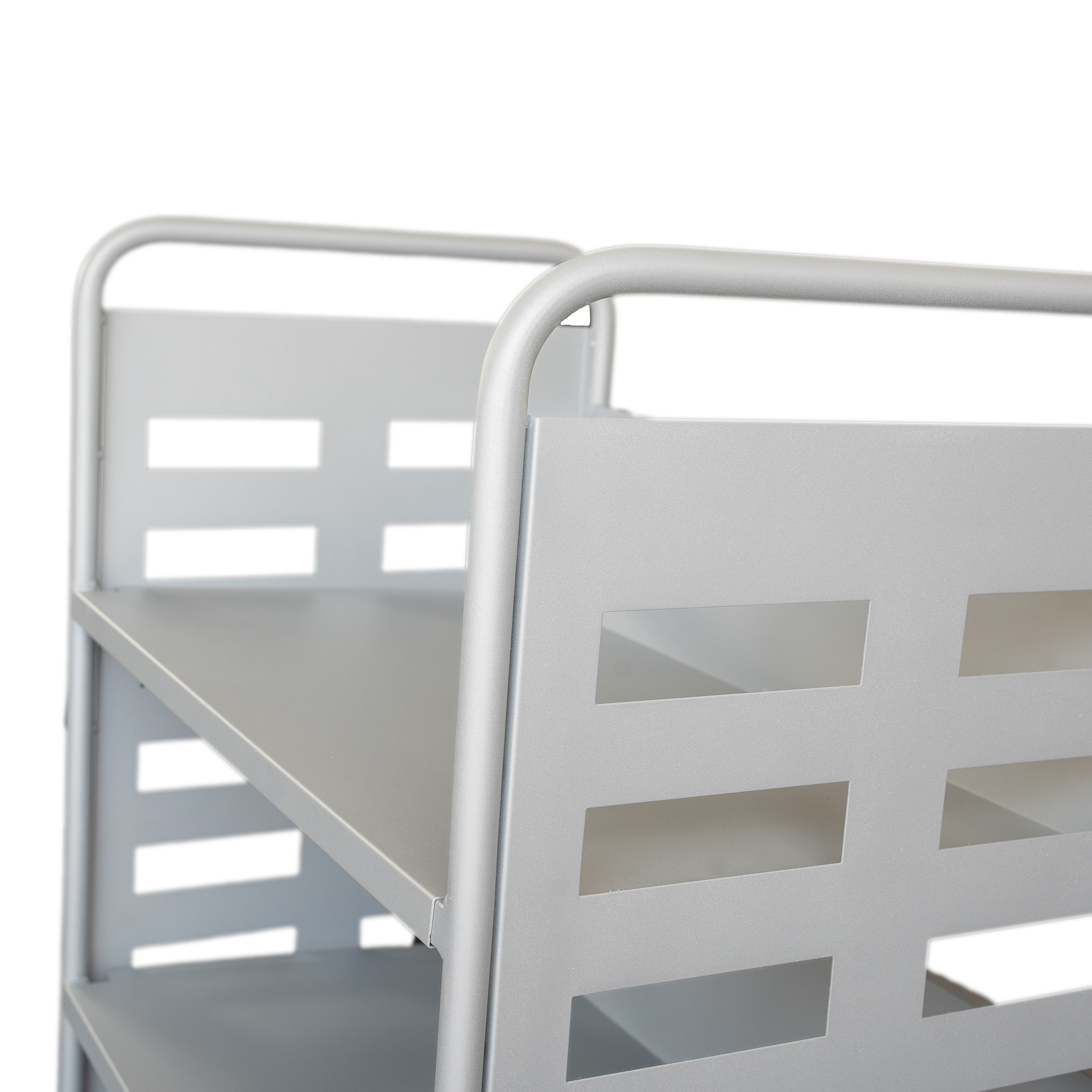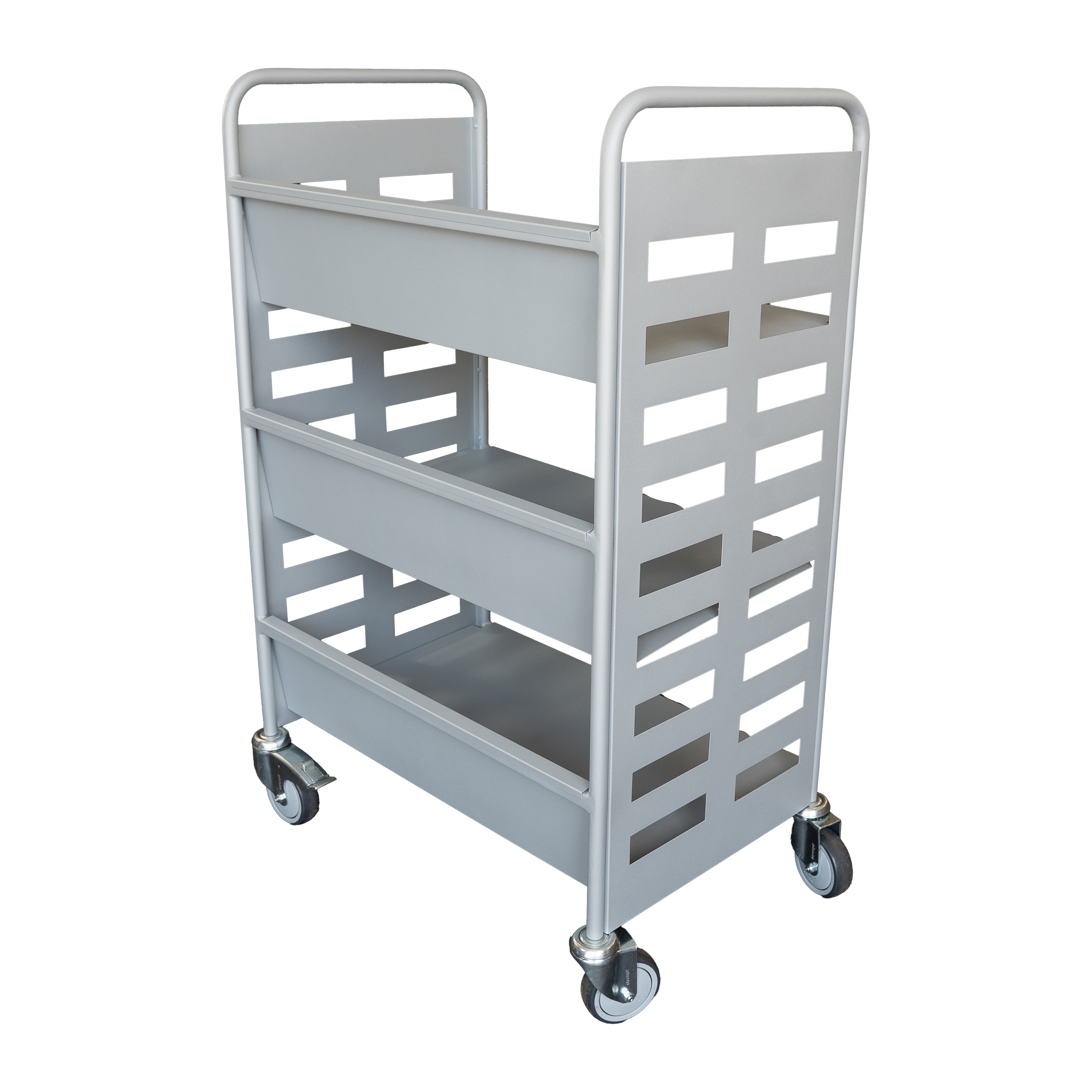 Knihovní vozík Matylda je vozík v celokovovém provedení, s vysokou nosností, vozík má 3 hluboké police, které jste poptávali. Matylda má boční designové perforované plechové bočnice, 3 kolečka + 1 kolečko s brzdou, průměr koleček 10 cm. Extra tichá pojezdová kola.