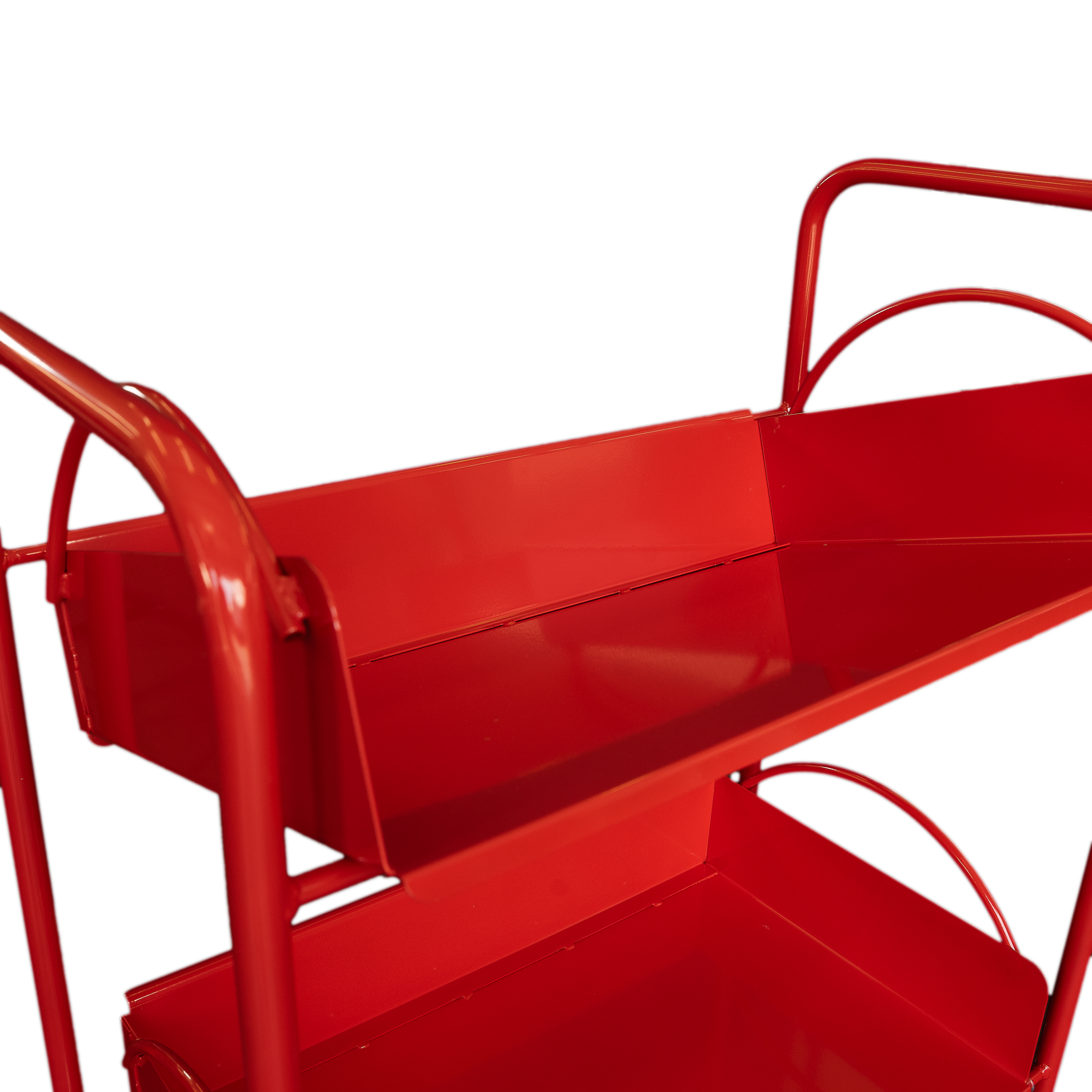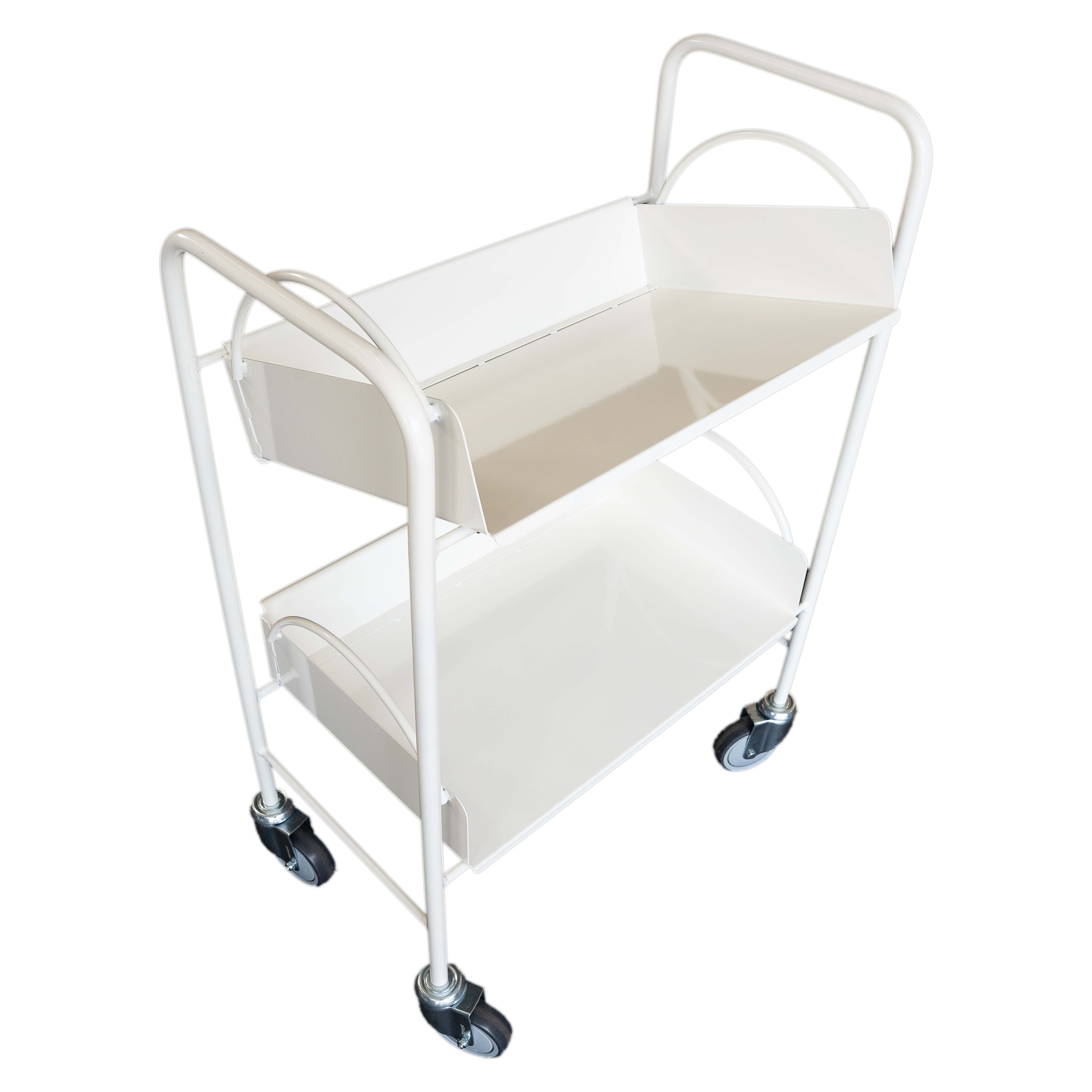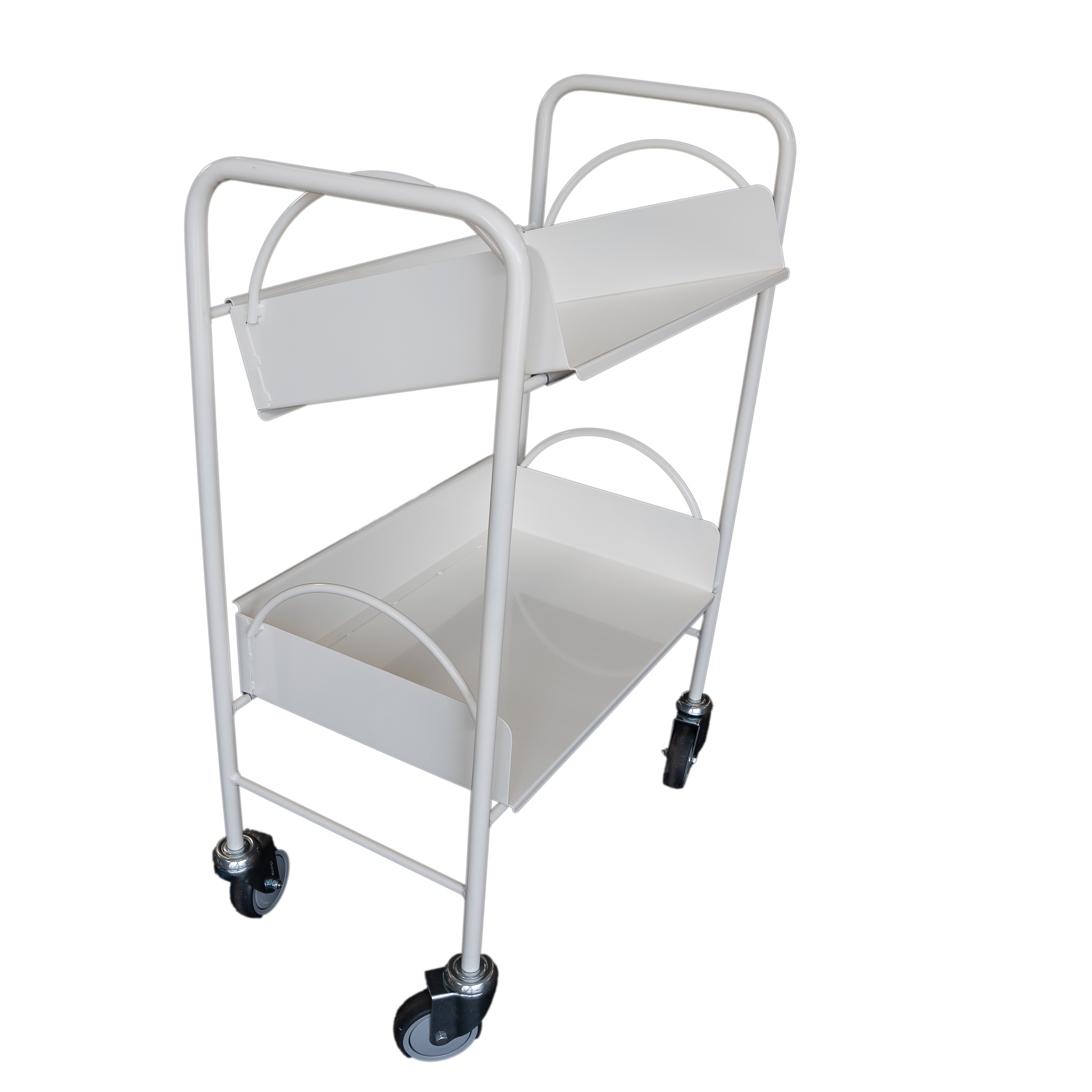 Celokovový vozík se dvěma volně loženými košíky, které lze zvozíku sejmout a použít na odkládání knih.