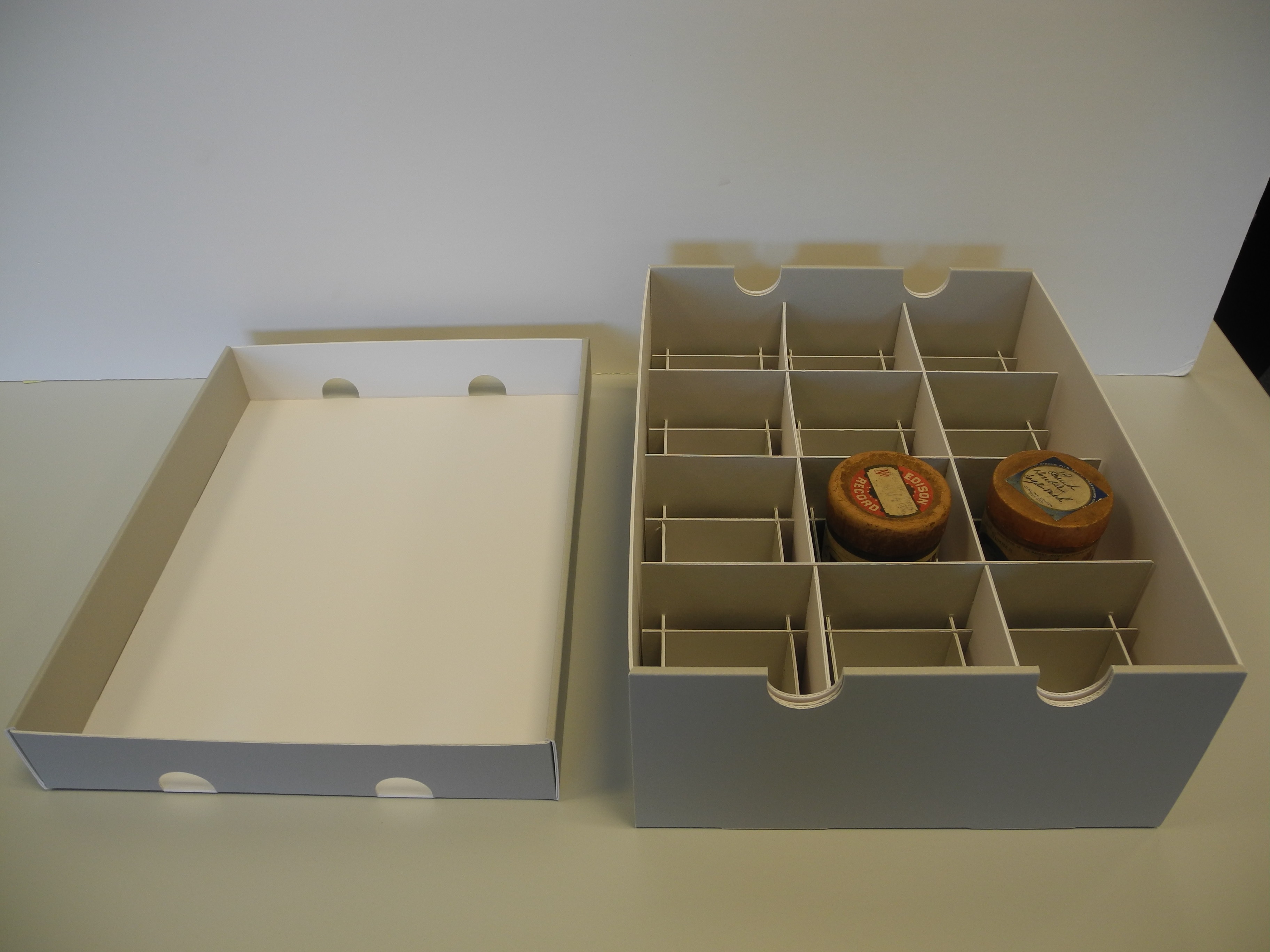 Krabice pro uložení obalů na fonografické válečky ACB boxy nebo původní obaly. Speciálně vyvinutá krabice s vnitřní integrovanou mřížkou pro aretaci obalů na fonografické válečky. Krabice je opatřena větracími otvory pro odvětrávání.